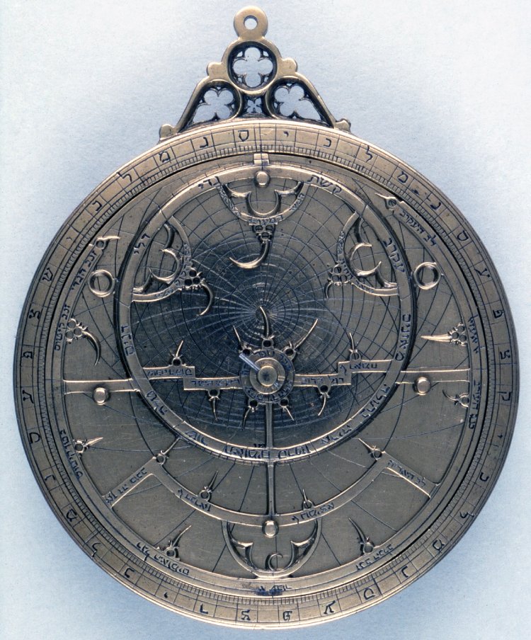 This exquisite small astrolabe with quatrefoil decoration is one of the very few known instruments of European origin with markings in Hebrew. The BM instrument is neither signed nor dated, but the style and the month names suggest it might have been made in 14th Century Spain or Italy.