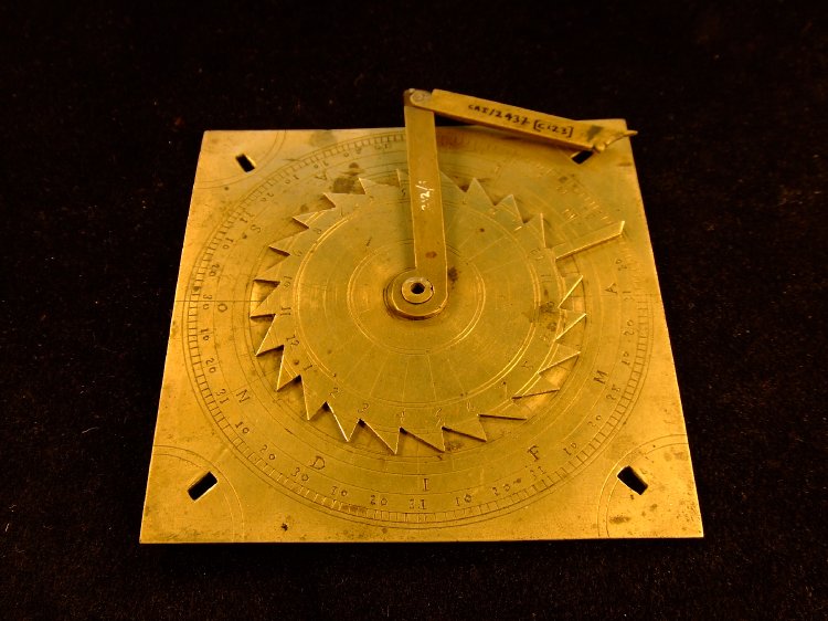 The top of the square is at 1 October. On the reverse, an incomplete lunar/solar time converter, with circular scale IXII, IXII anticlockwise; above this, a rotating disc with index is inscribed 1-291/2 clockwise. The engraving lacks refinement.