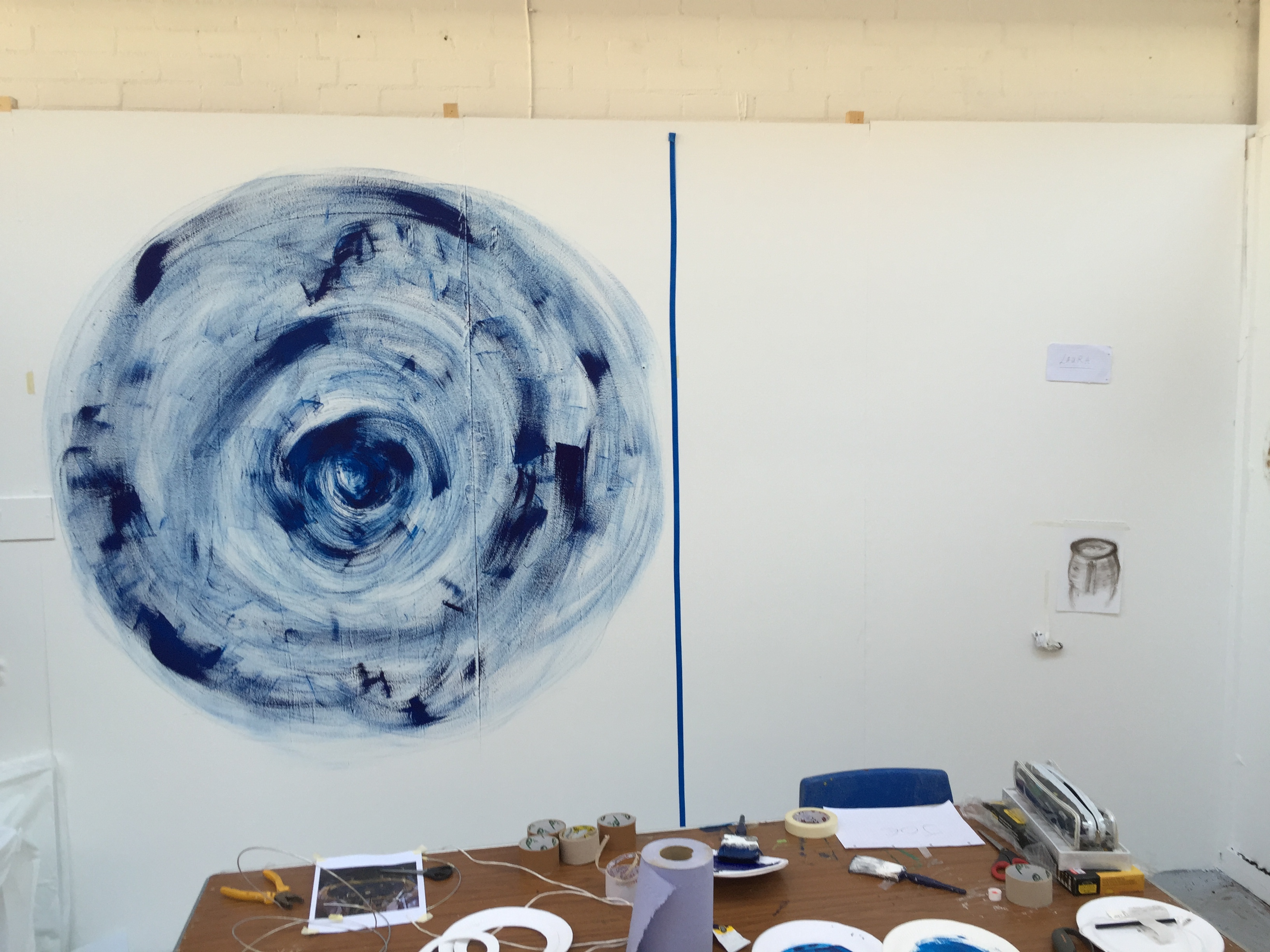 My current work was initially inspired by how planets move around the solar system. The idea of the solar system moving around in circles inspired me to create a circular painting made up using brush strokes made from me moving my arm in a circular motion.