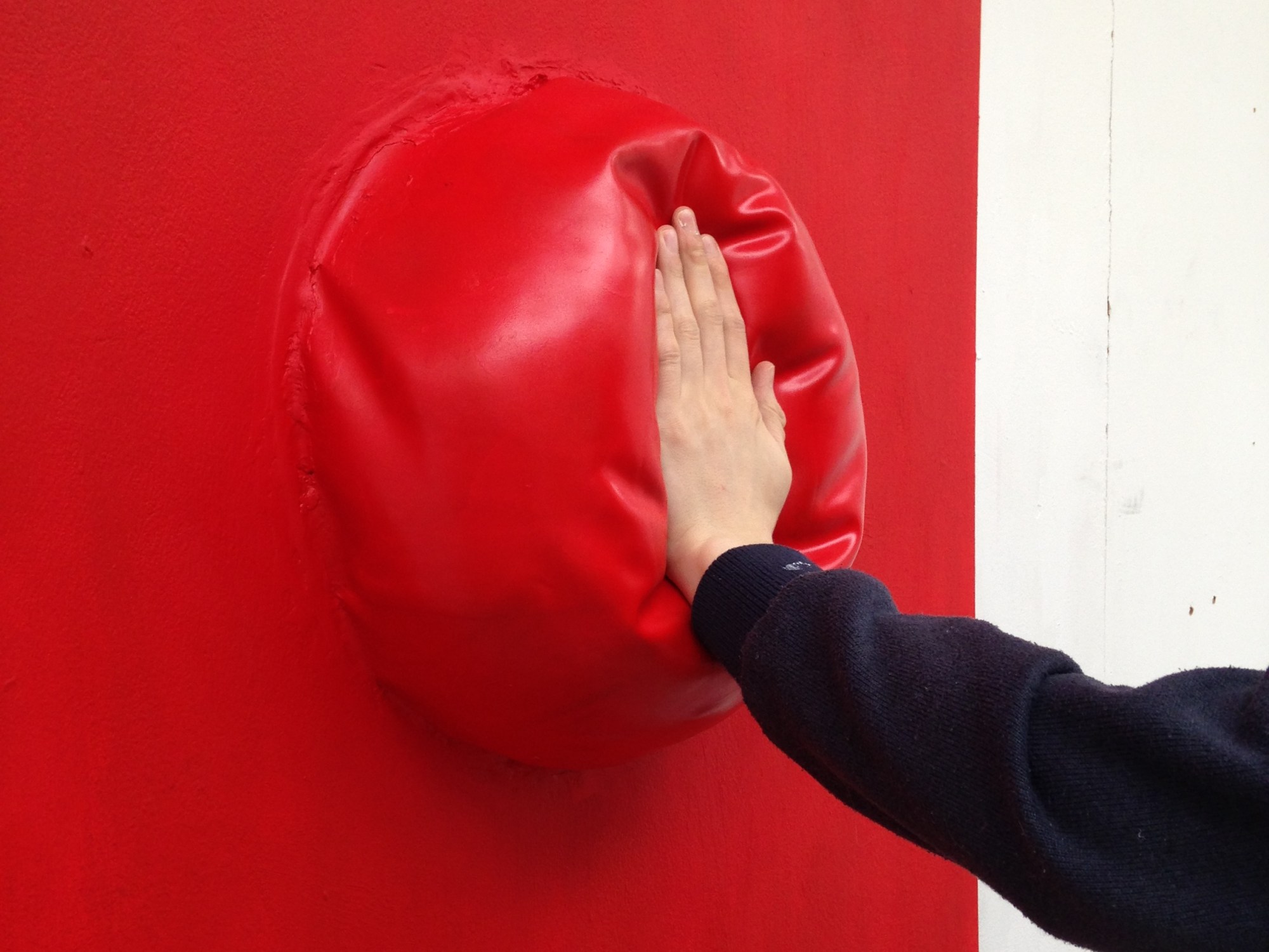 This is made from half a space hopper stuffed with the insides of pillow and sprayed cadmium red the same as the other red wall works. I stapled the hopper to the wall and used a polyfiller around the edge to get a smoother and paintable attachment which also hides the staples. compared to the previous red wall hemisphere this one is opposite as it is soft inviting the viewer to interact with it by squishing with the hand which then moulds to the shape of your hand before gently returning to its natural state afterwards.
