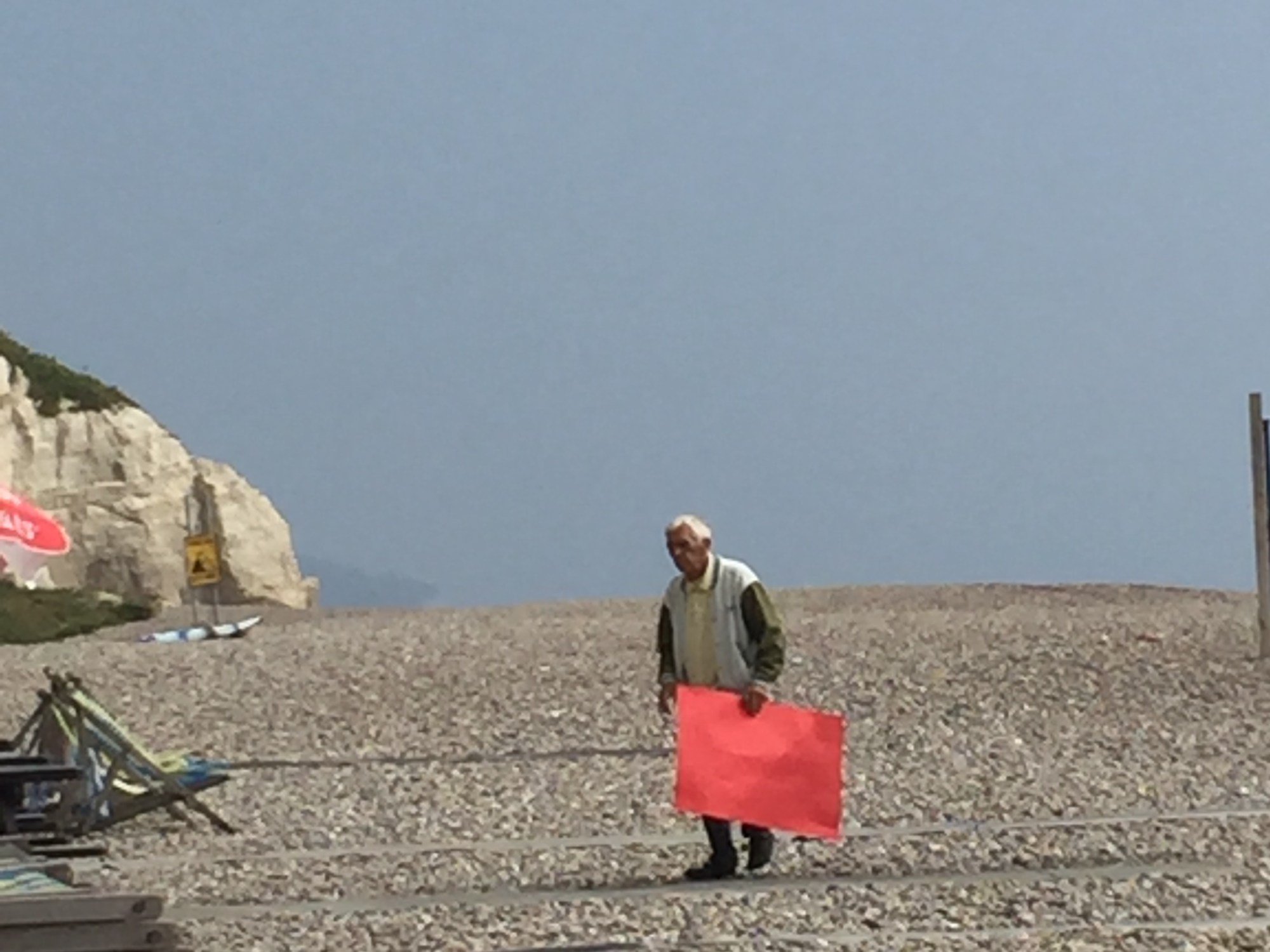 Nothing was happening until an elderly man spotted the work. He went over and picked it up, although it was held in place by plenty of stones and walked off with it. He went up some stairs towards some beach huts and disappeared. He did re-amerge later but without the work.