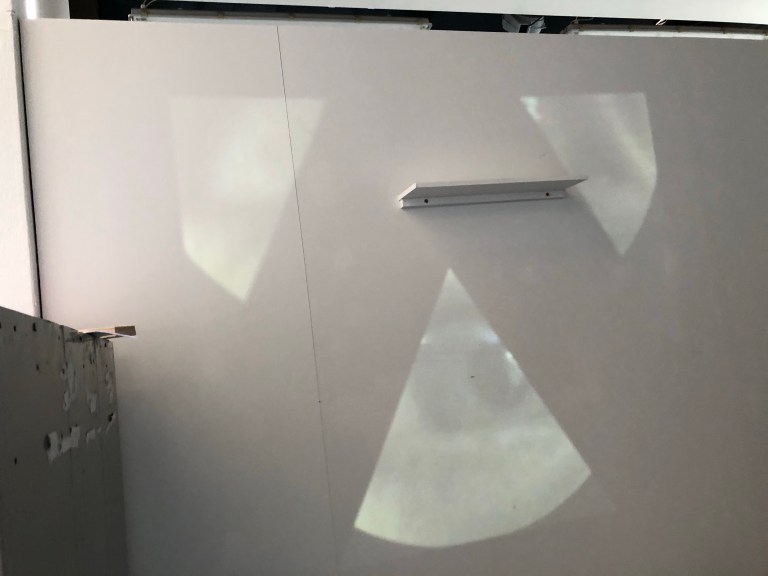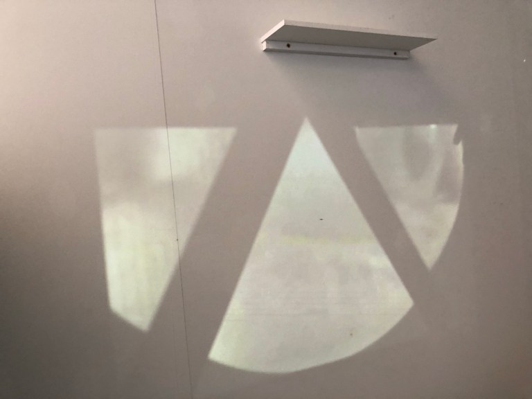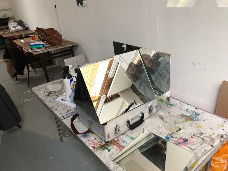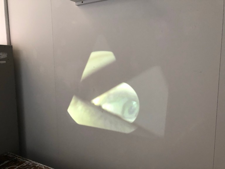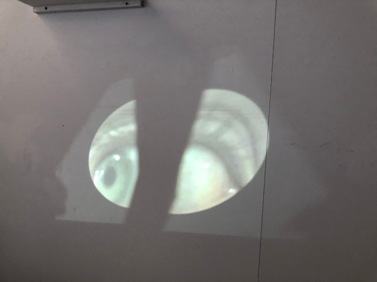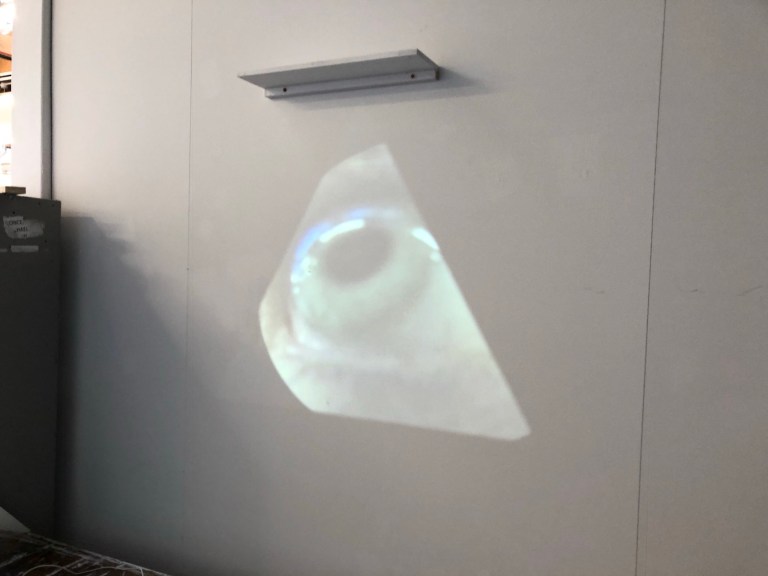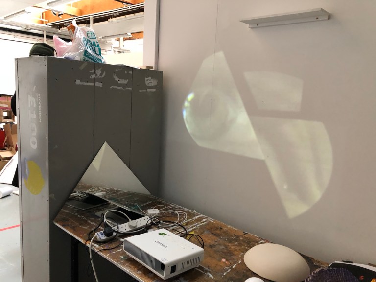 While I was projecting my eye onto my plaster dome I thought I thought about reflecting the eye up high onto a shelf where i was able to place the dome. I placed a triangular mirror in front of the project and accidentally cut the projection in half. both halfs of my eye was was at either ends of the studio using this i was able to gather lots of mirror and place them in particular paths of the projection to fragment and move the different fragments in space.