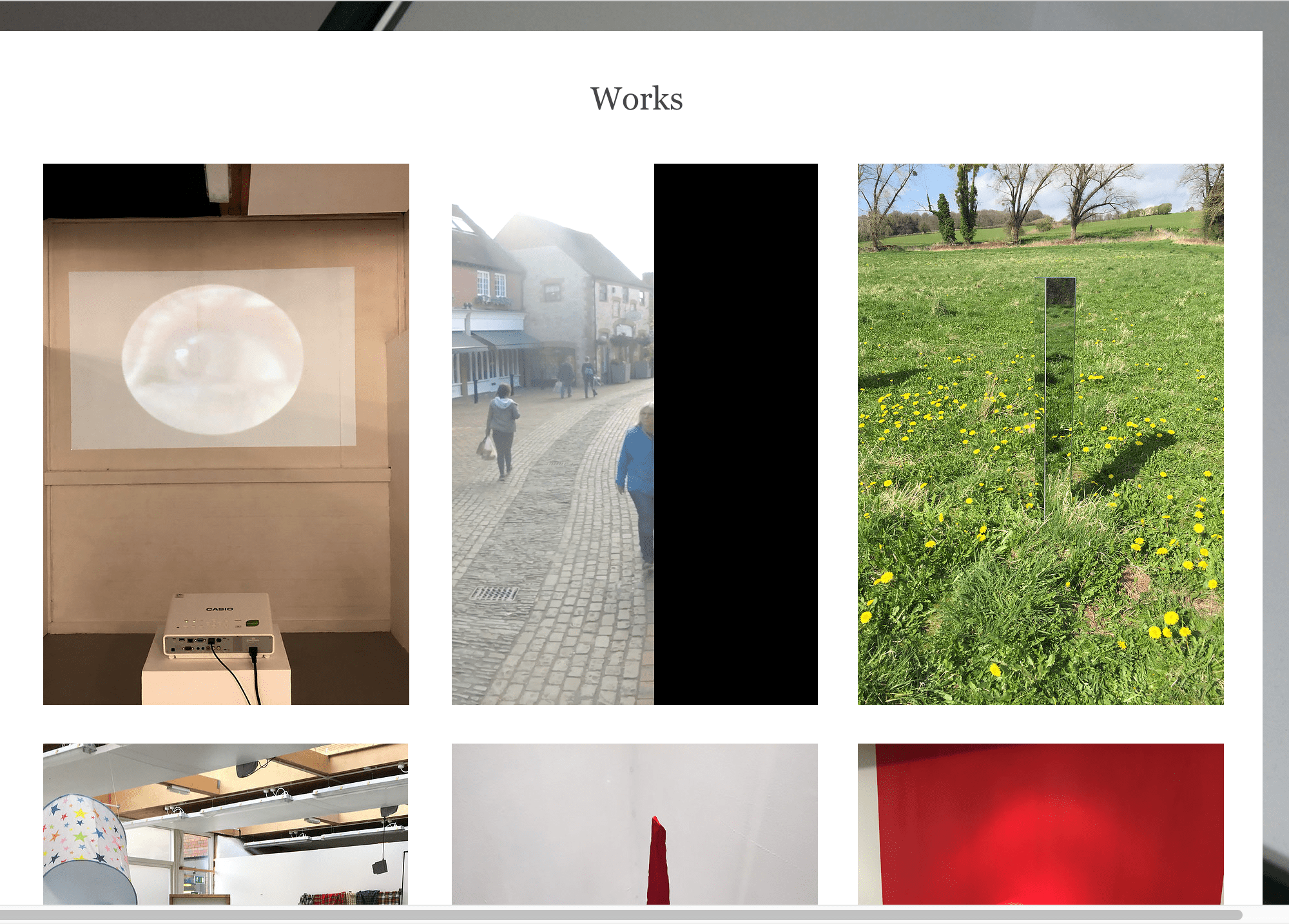 currently my works page consists of selected works I have made throughout the course. I am currently considering reworking this page to add an archive page link where all of my less prominent or older artwork would go. when hovering over the images the works title appears which when then clicked on loads up the artworks webpage which has a collaged Tiled gallery.