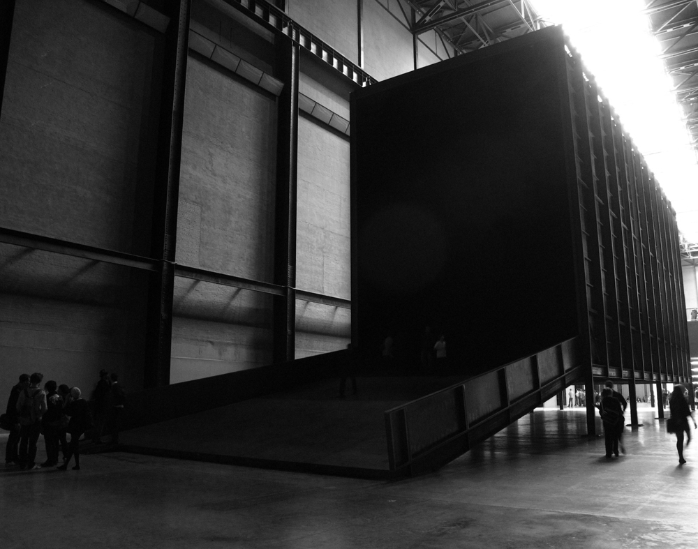 the piece appears from outside as a large black box upon entering the turbine hall, before revealing from one side a ramp leading inside which gets darker the further inside until there is no light left and the partipnts are unable to see there surrounding as they find themselves in complete blackness.
