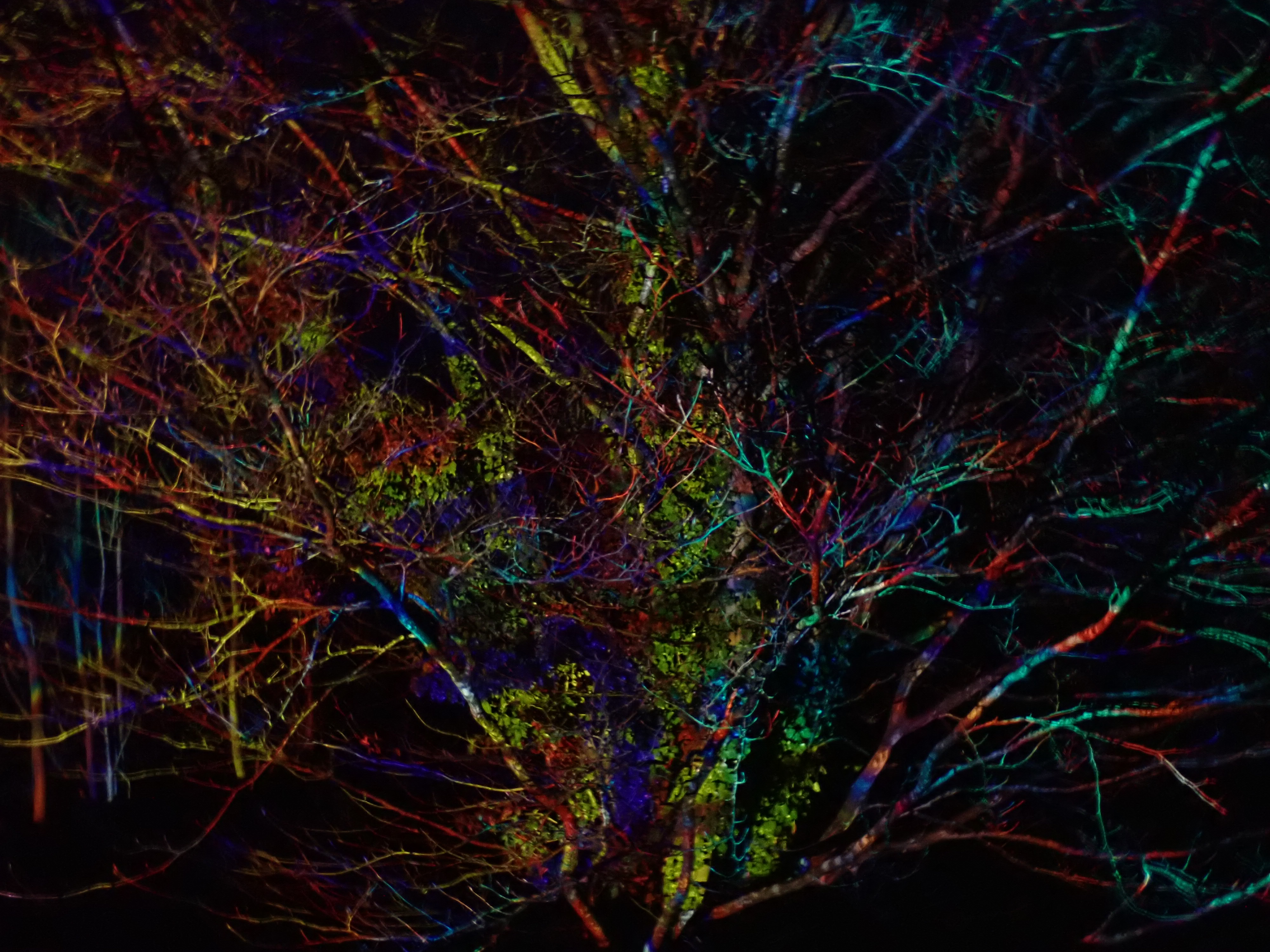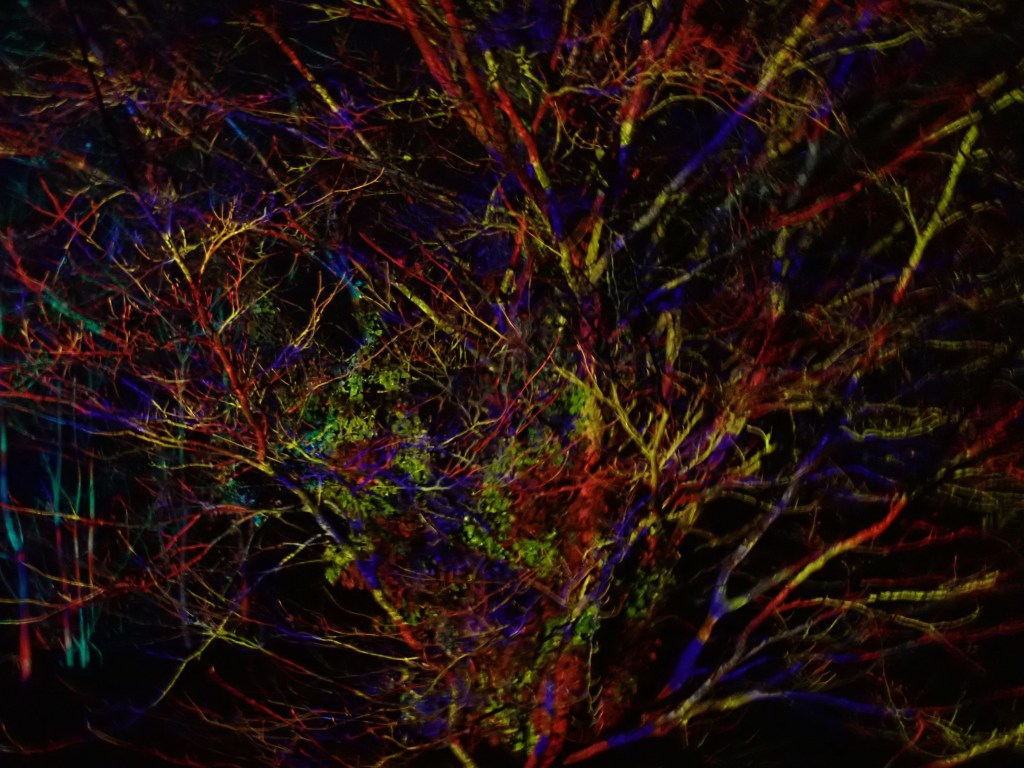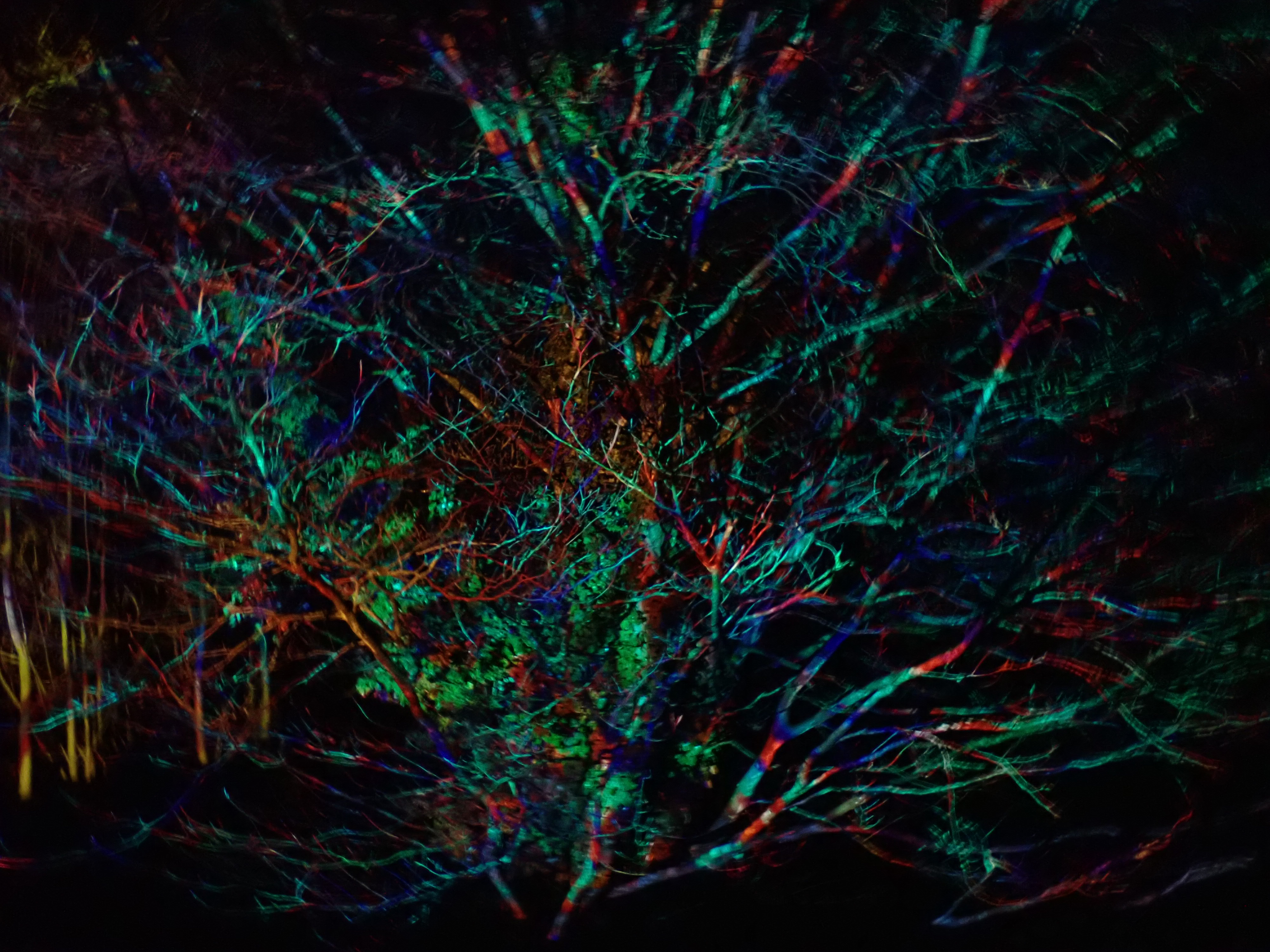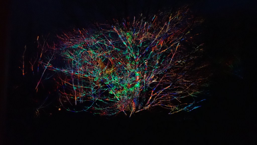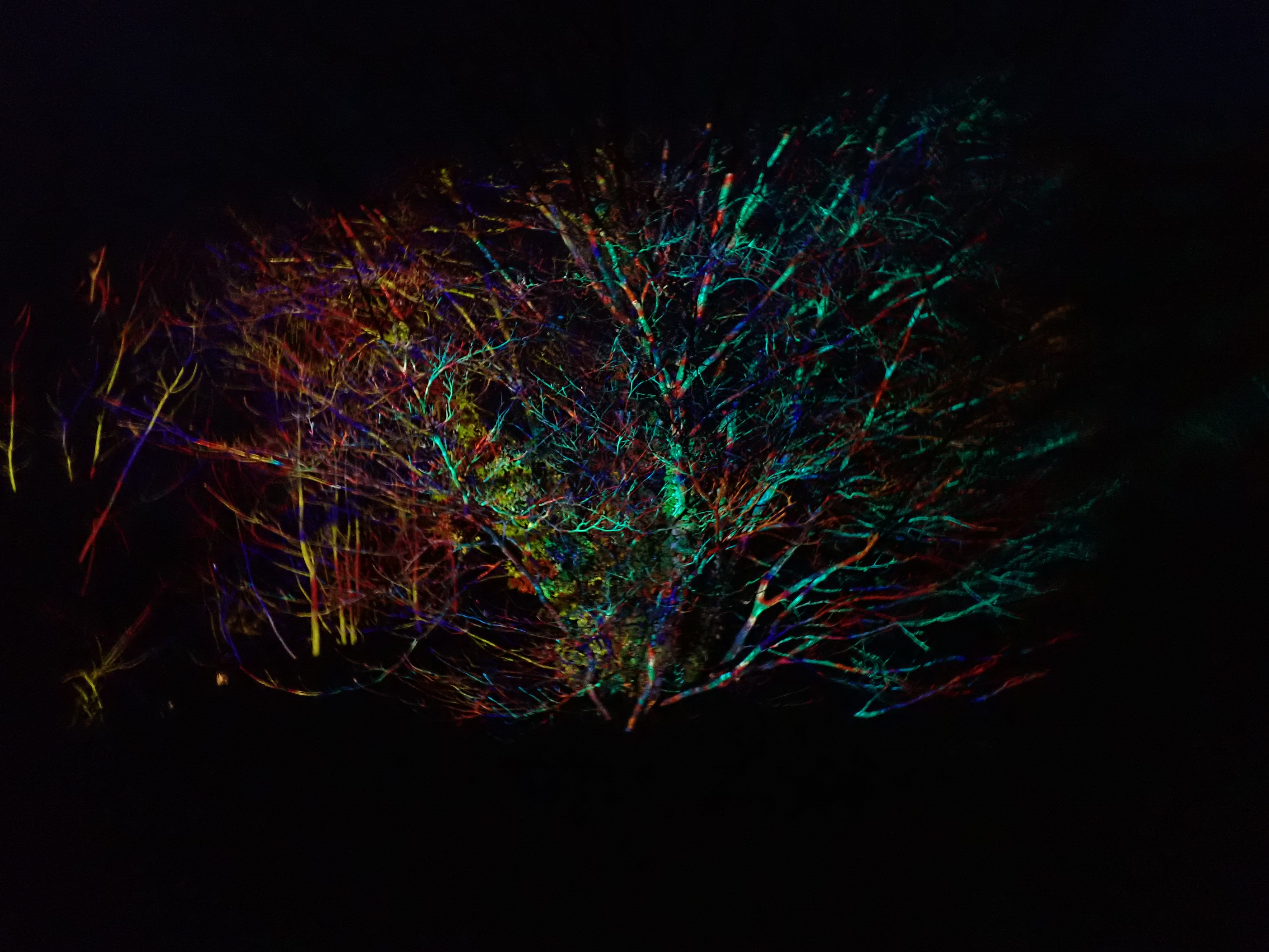 Instantly I knew I wanted to experiment with my projector, to test its capabilities and range. My instinct was to focus on illuminated colour rather than specific imagery. I played with directing the projector from a downstairs window, onto the tree outside. Here is the result!