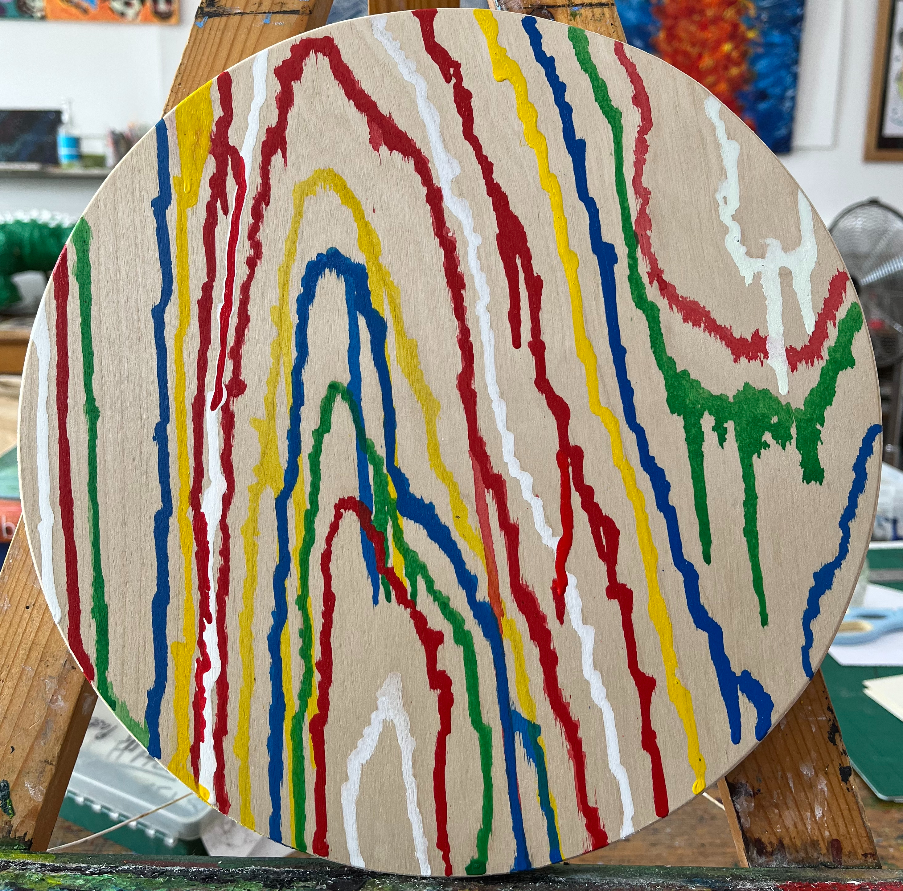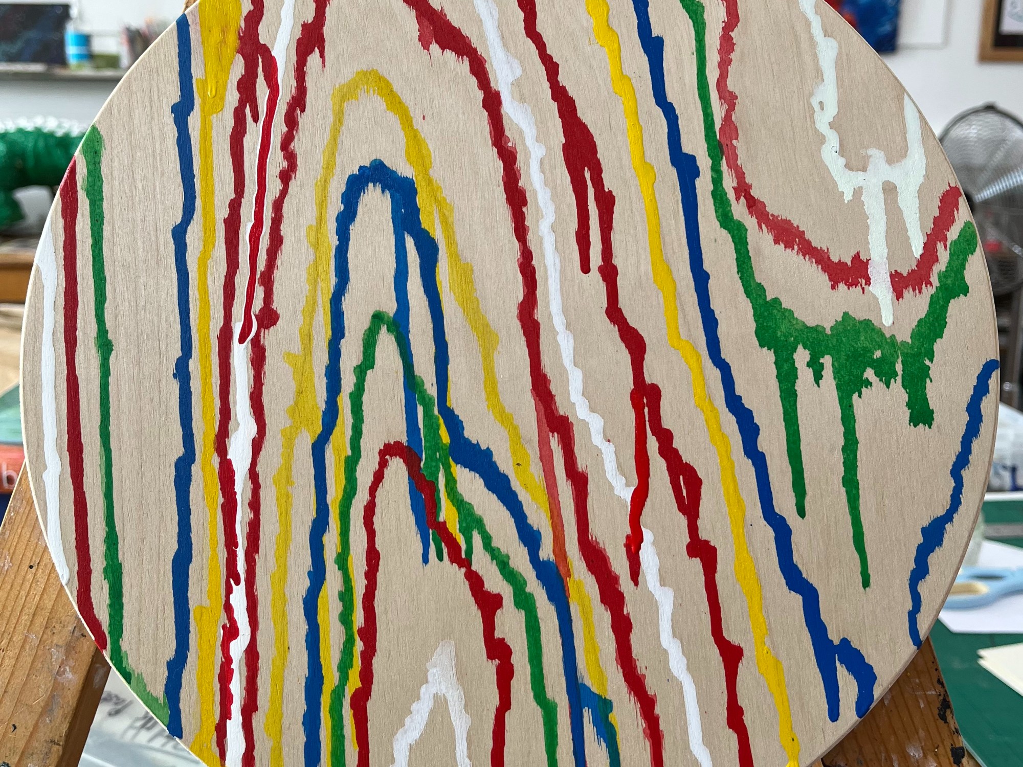 I have been using plywood and acrylic paint mixed with water to allow gravity to take over, to have a say in how and where the paint travels. Although gravity was in control of the paint, I used paint or sometimes water to encourage the desired path. The grain is of interest to me, to go with the grain rather than against it. My intention is to work with the natural grain and enhance its features with coloured ‘sap’.